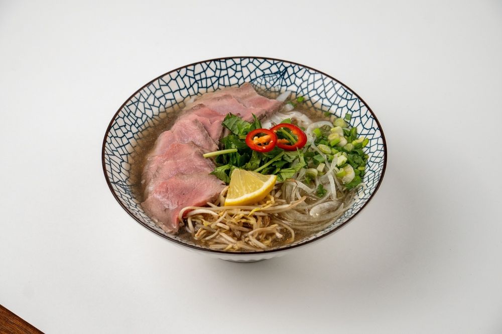 Традиционный суп с рисовой лапшой, говядиной, красным и зеленым луком, ростками сои, свежей зеленью и говяжьим бульоном.