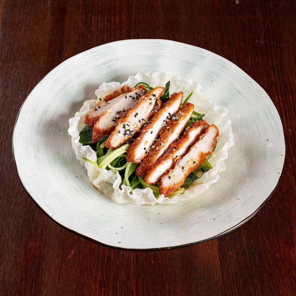 Свежий салат со шпинатом, ростками сои, огурцом, курицей темпура с легким цитрусовым соусом.