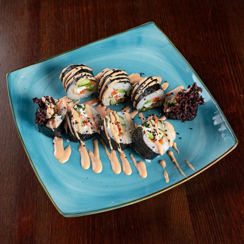 Корейский ролл с рисом, огурцом, морковью, маринованным дайконом, салатом лоло росса.