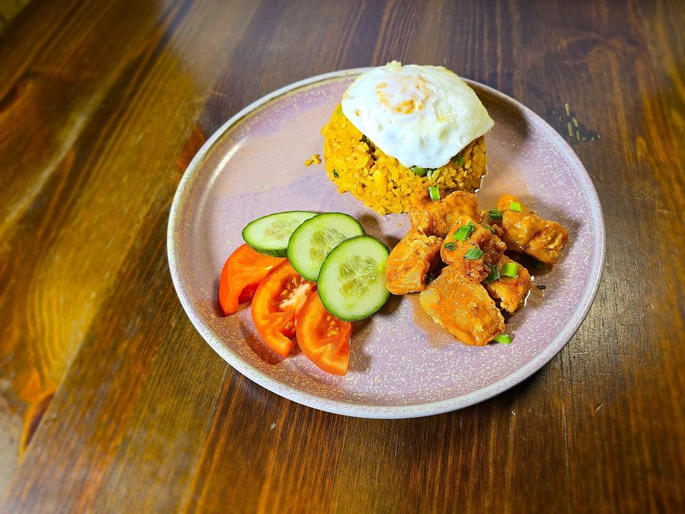 Жареный рис со специями, курицей, яйцом, горошком, кукурузой, морковью, огурцом, томатами.