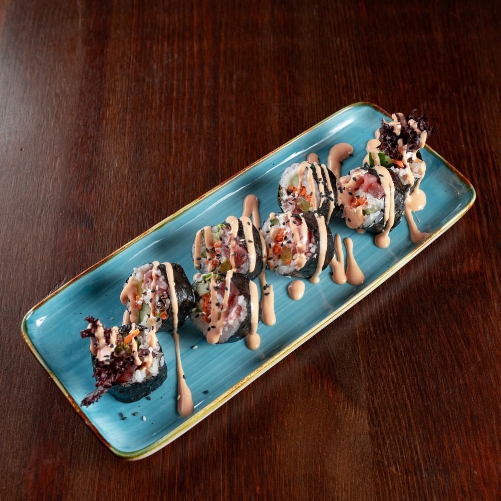 Корейский ролл с рисом, тунцом, творожным сыром, огурцом, морковью, маринованным дайконом, салатом лоло росса.