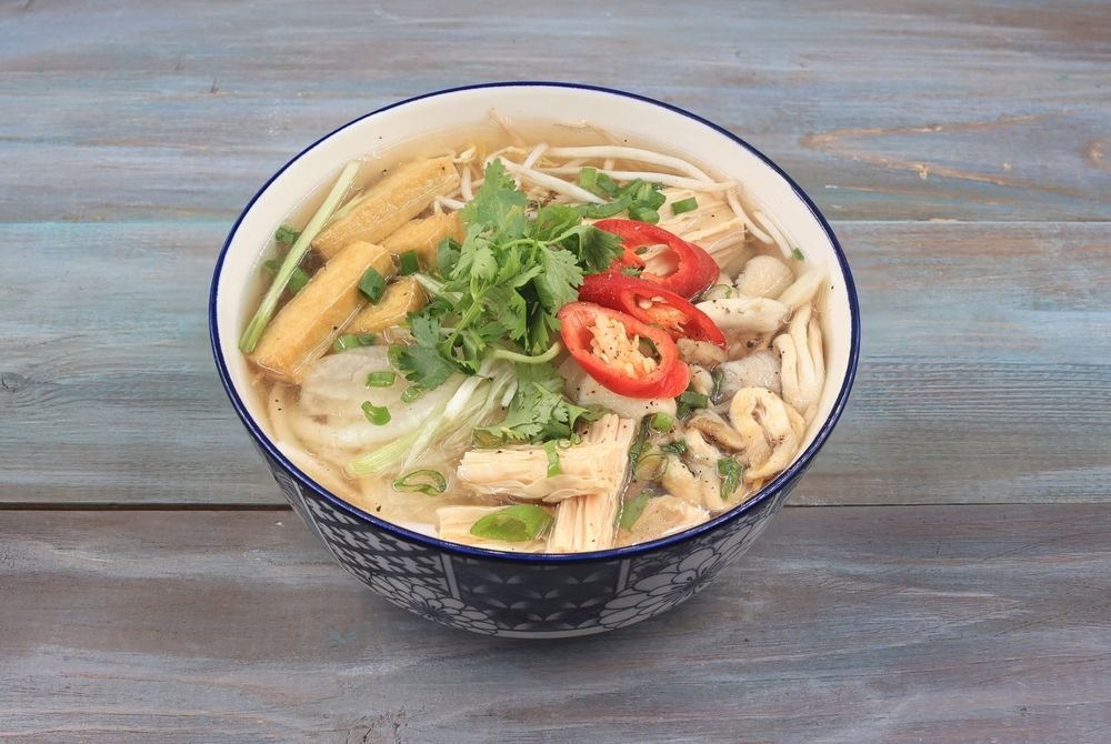 Вегетарианский суп с рисовой лапшой, тофу, спаржей, вешенками, свежей зеленью.