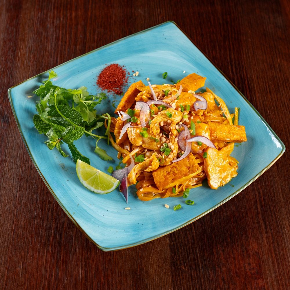 Рисовая лапша с курицей, креветками, сыром тофу, ростками сои, яйцом.