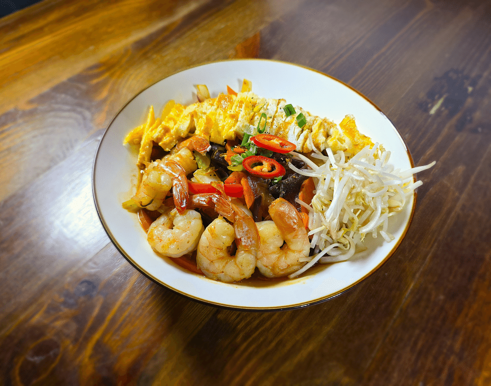Стеклянная лапша с креветками, китайской капустой, грибами шиитаке, сельдереем, морковью, болгарским перцем, ростками сои, красным луком и омлетом.
