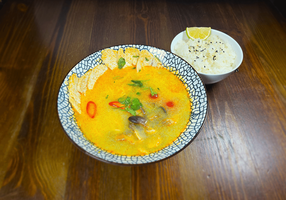 Суп на бульоне из галангала, лемонграсса, кокосовых сливок и лайма с паровым рисом, отварной куриной грудкой, вешенками, томатами черри и зеленью.