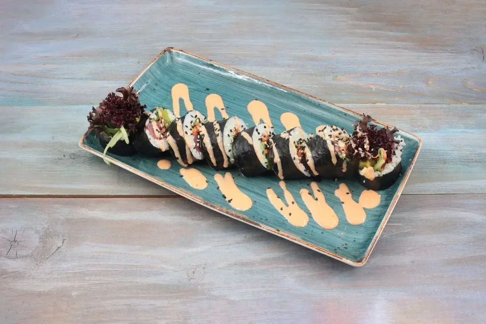 Корейский ролл с рисом, обжаренной говядиной, творожным сыром, огурцом, морковью, маринованным дайконом, салатом лоло росса.