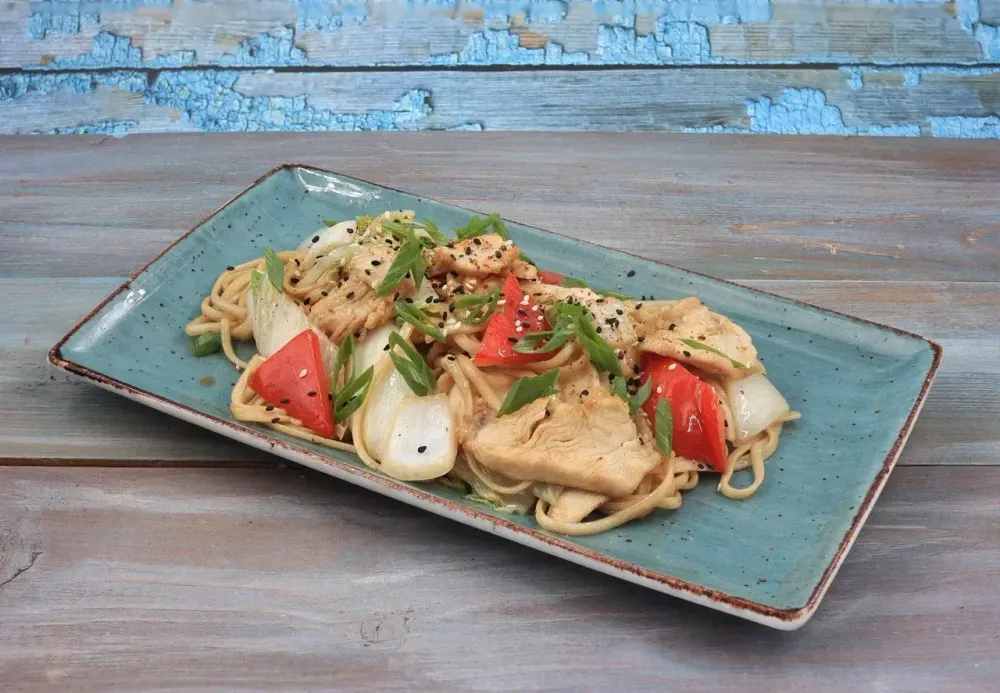 Пшеничная лапша, куриное филе, болгарский перец, китайская капуста, ростки сои, зеленый лук.