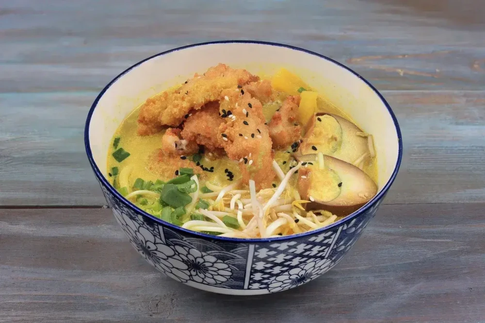 Сливочно-сырный бульон с пшеничной лапшой, маринованным яйцом, ростками сои, дайконом и хрустящей курицей темпура.
