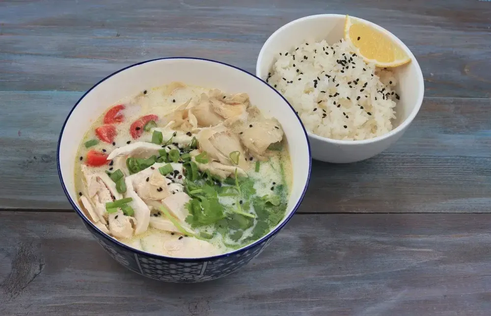 Суп на бульоне из галангала, лемонграсса, кокосовых сливок и лайма с паровым рисом, отварной куриной грудкой, вешенками, томатами черри и зеленью.