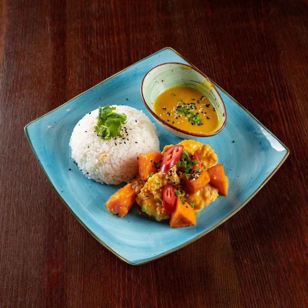 Паровой рис, куриное филе, батат, морковь, соус карри, кинза.